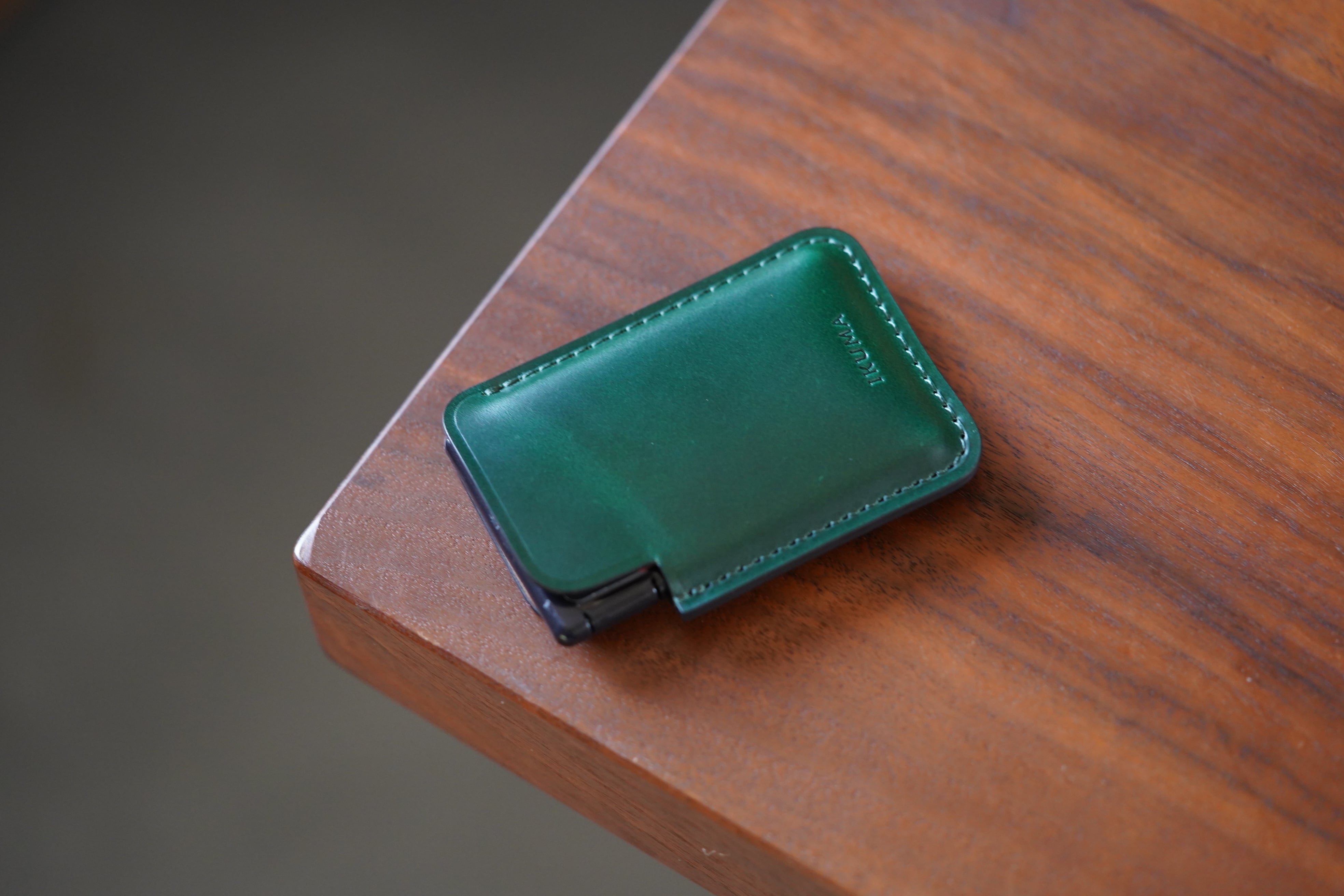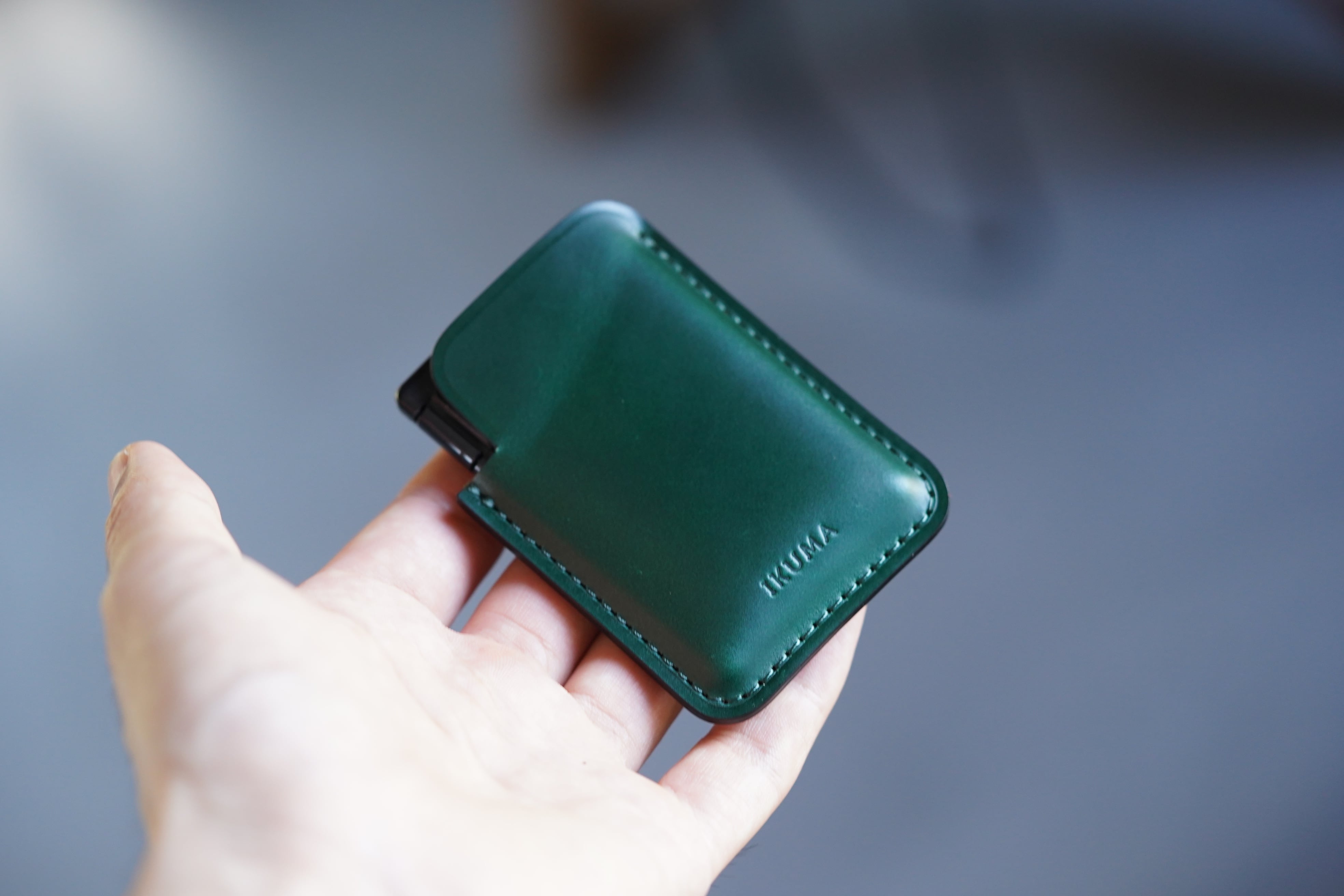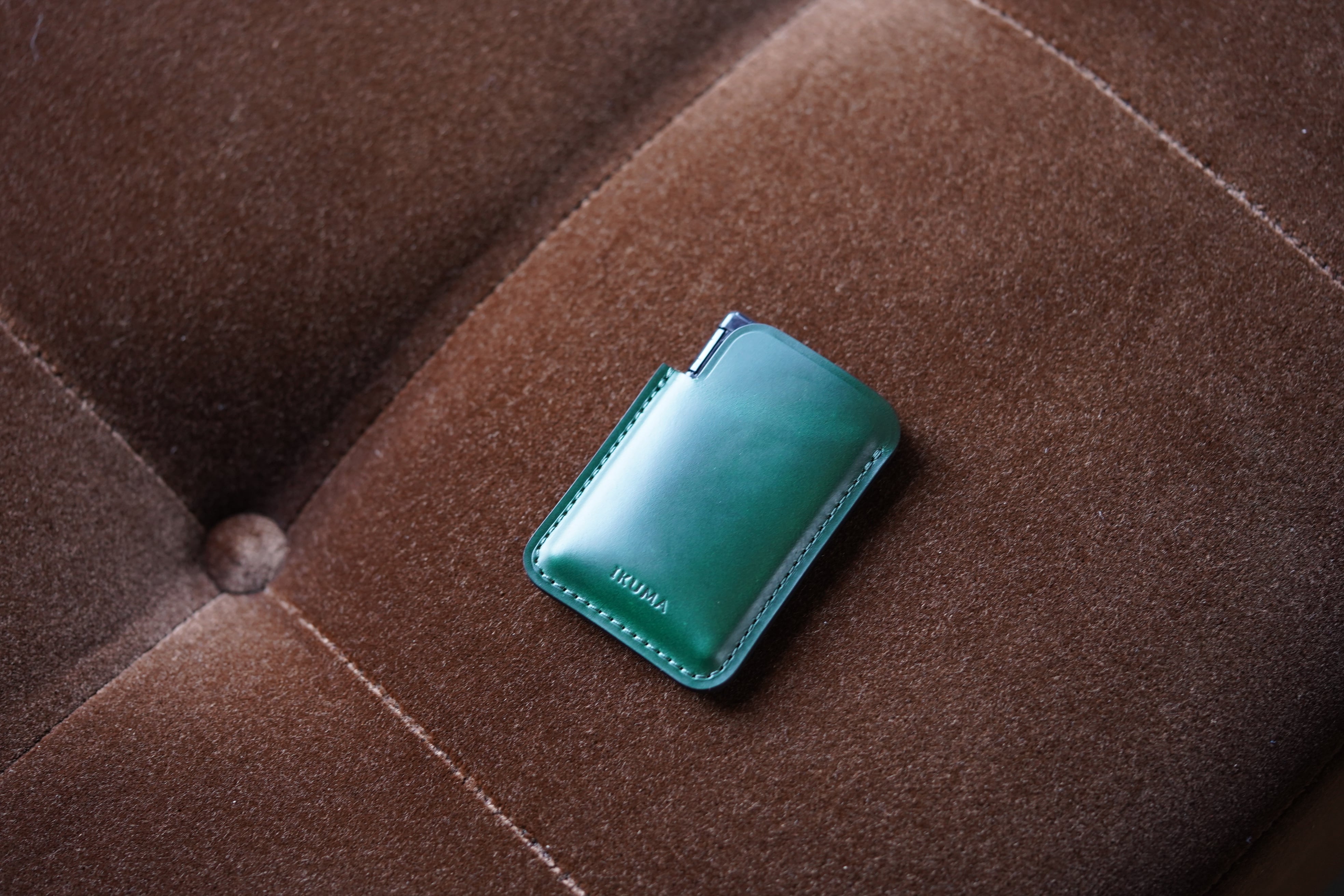 今回はレーデルオガワのコードバンで製作しました。使用に伴い色艶変化してゆきますし、ミンティアを入れた際のコードバン特有のシルエットが魅力です。コードバン特有の経年変化をお楽しみください。