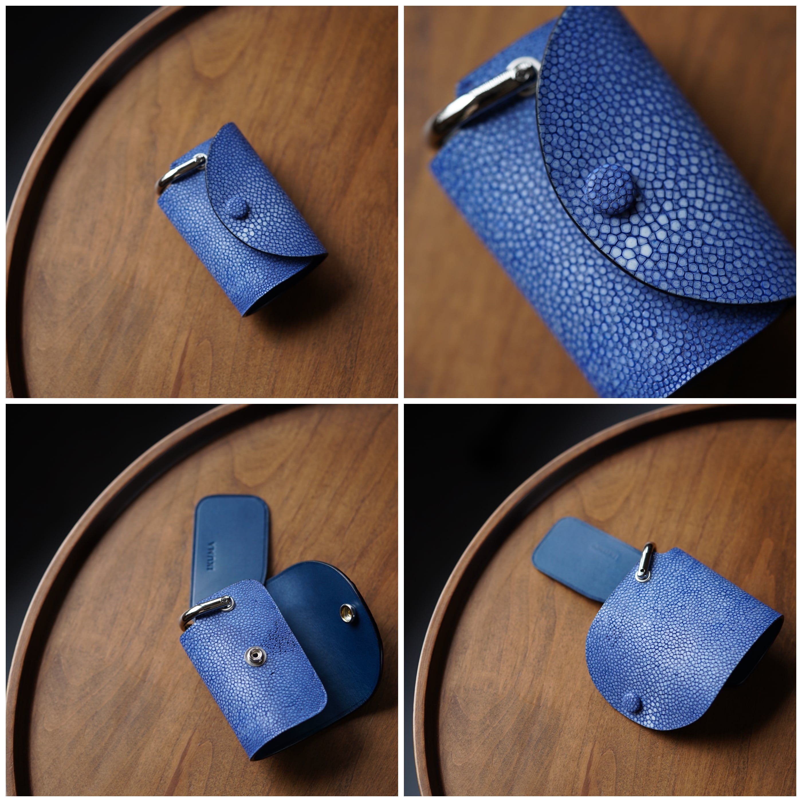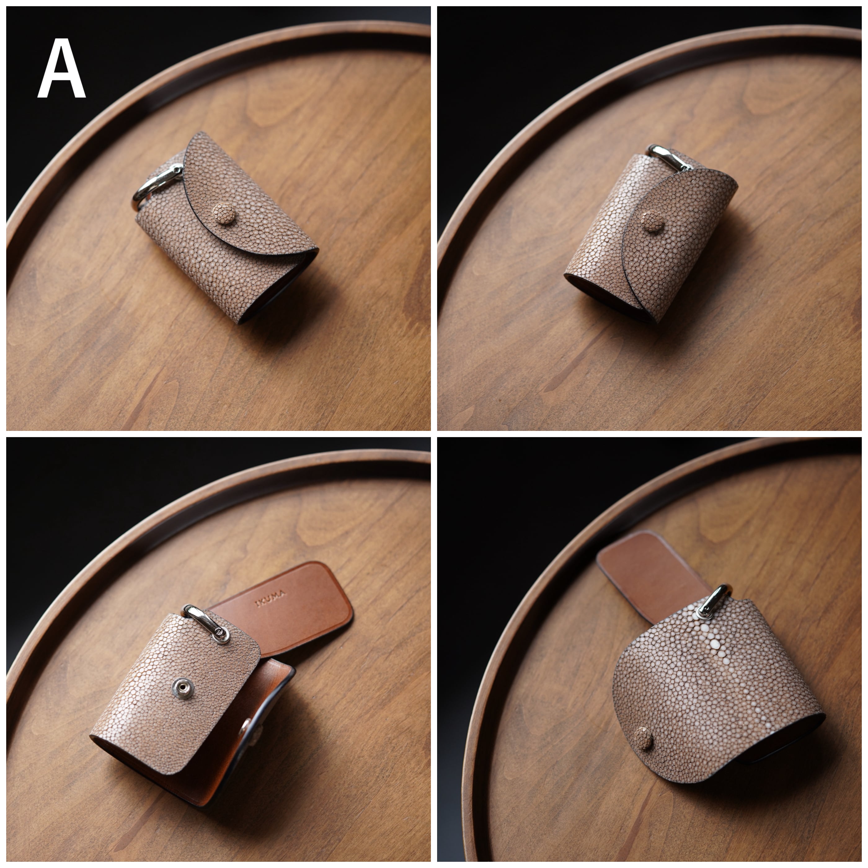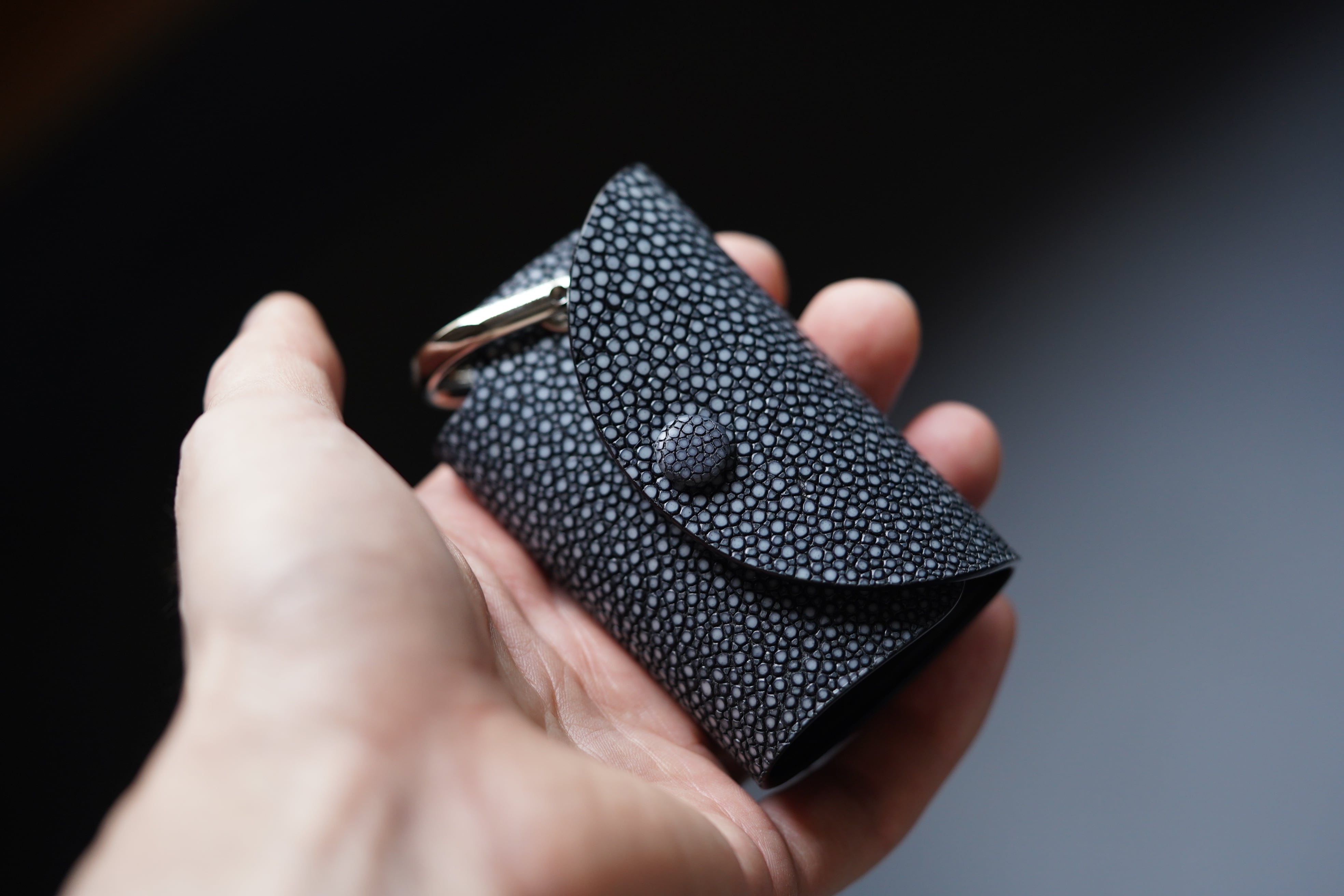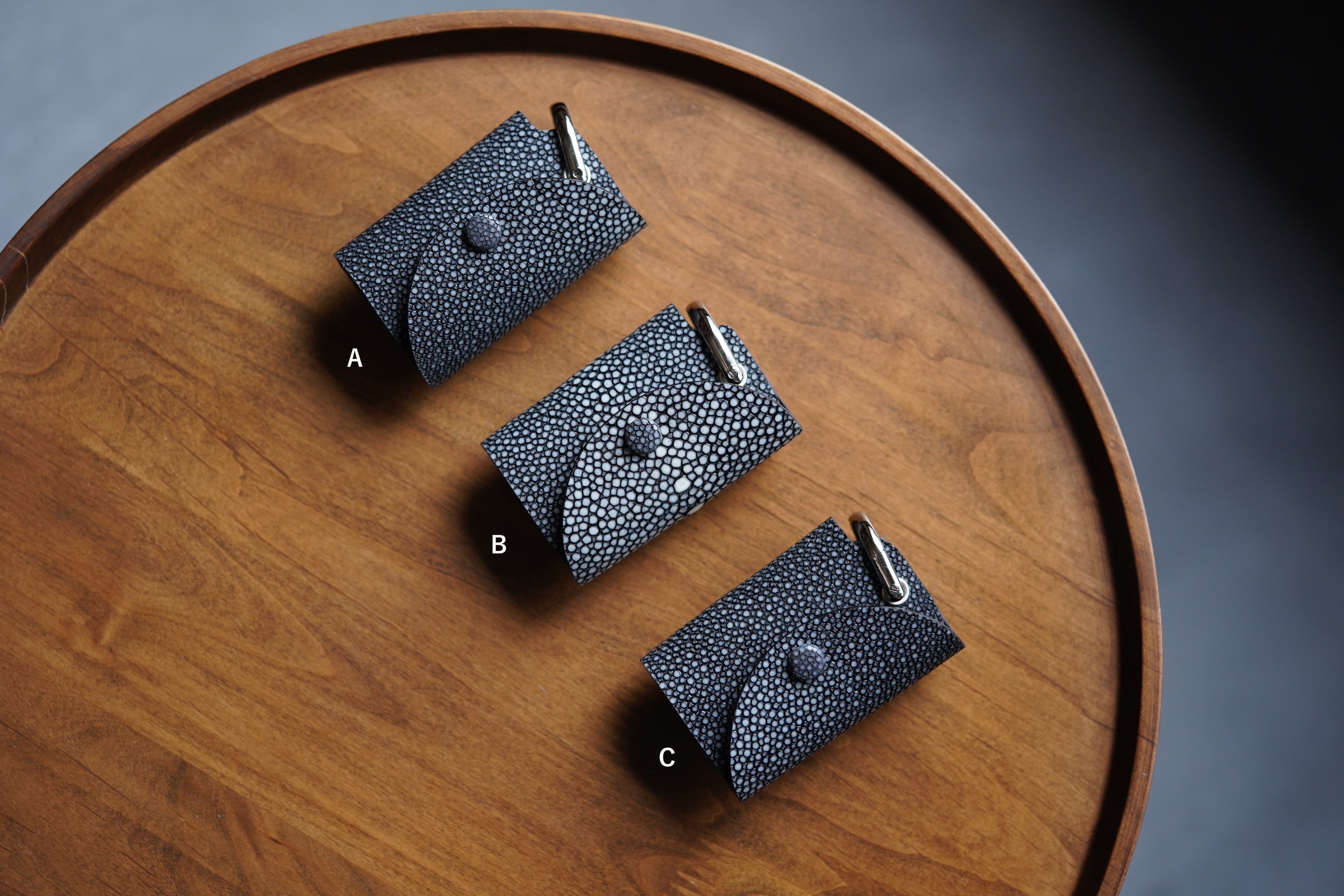 表面を平らに削った「吟スリ」のエイ革を使用。光源の下で宝石のようにキラキラ光る独特の革。