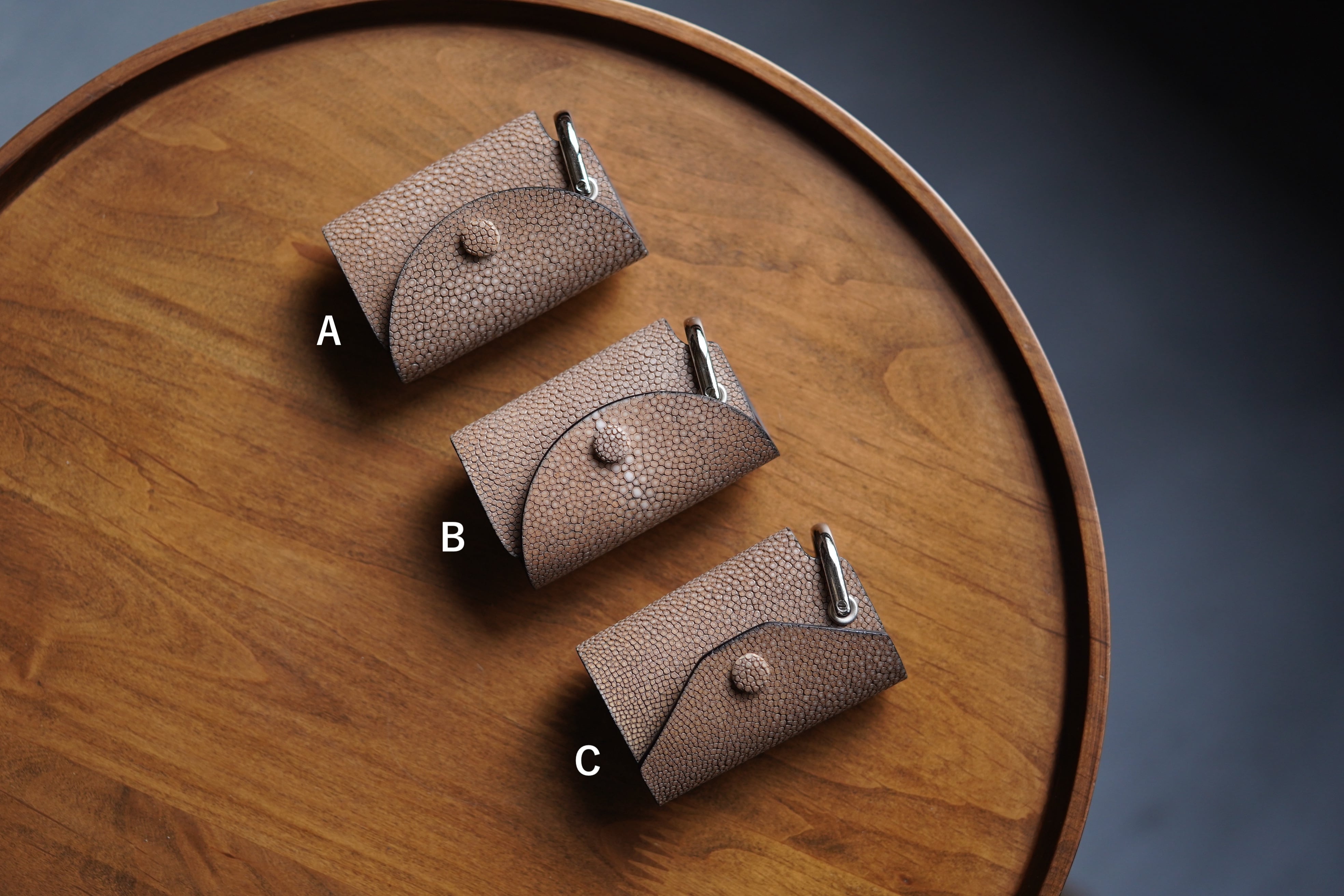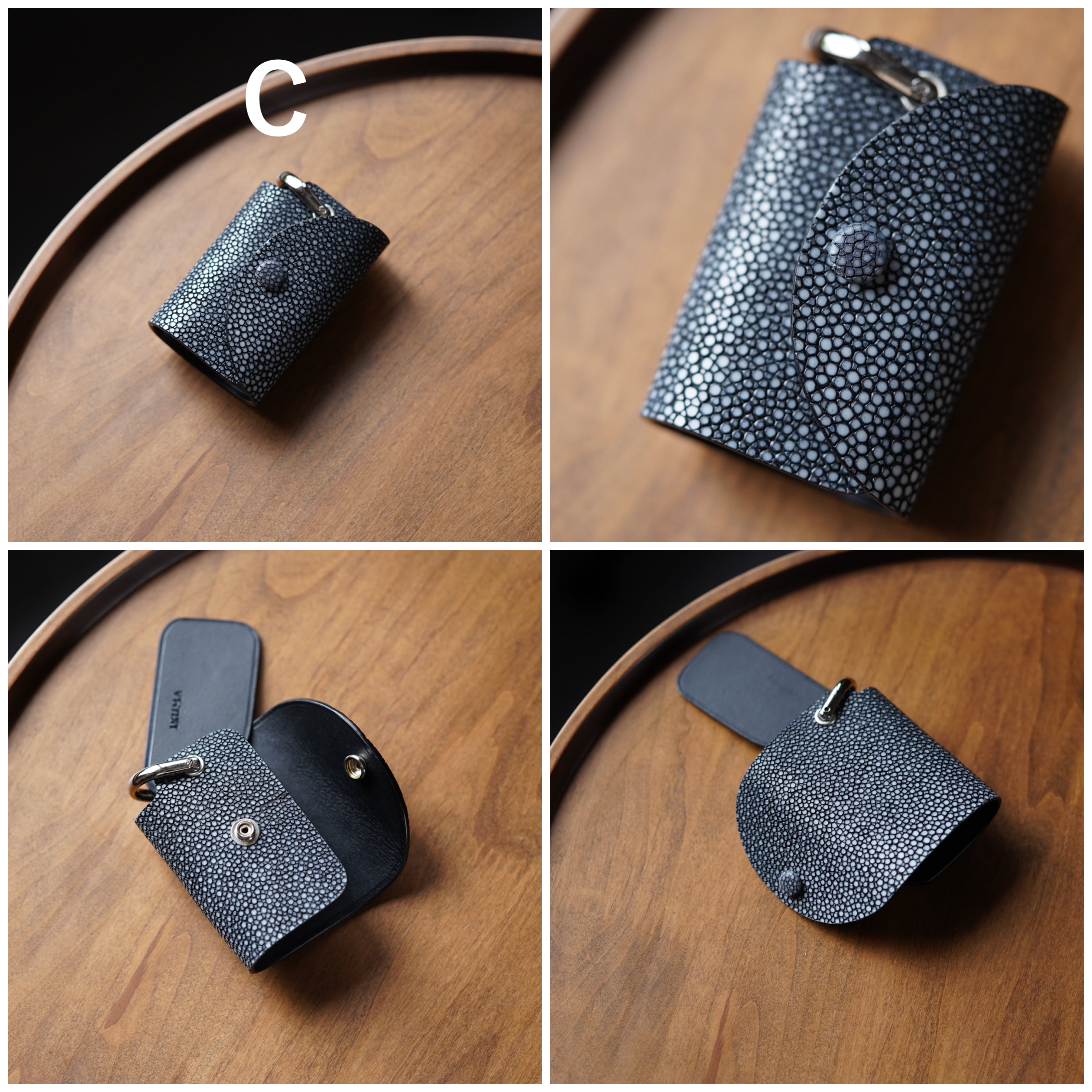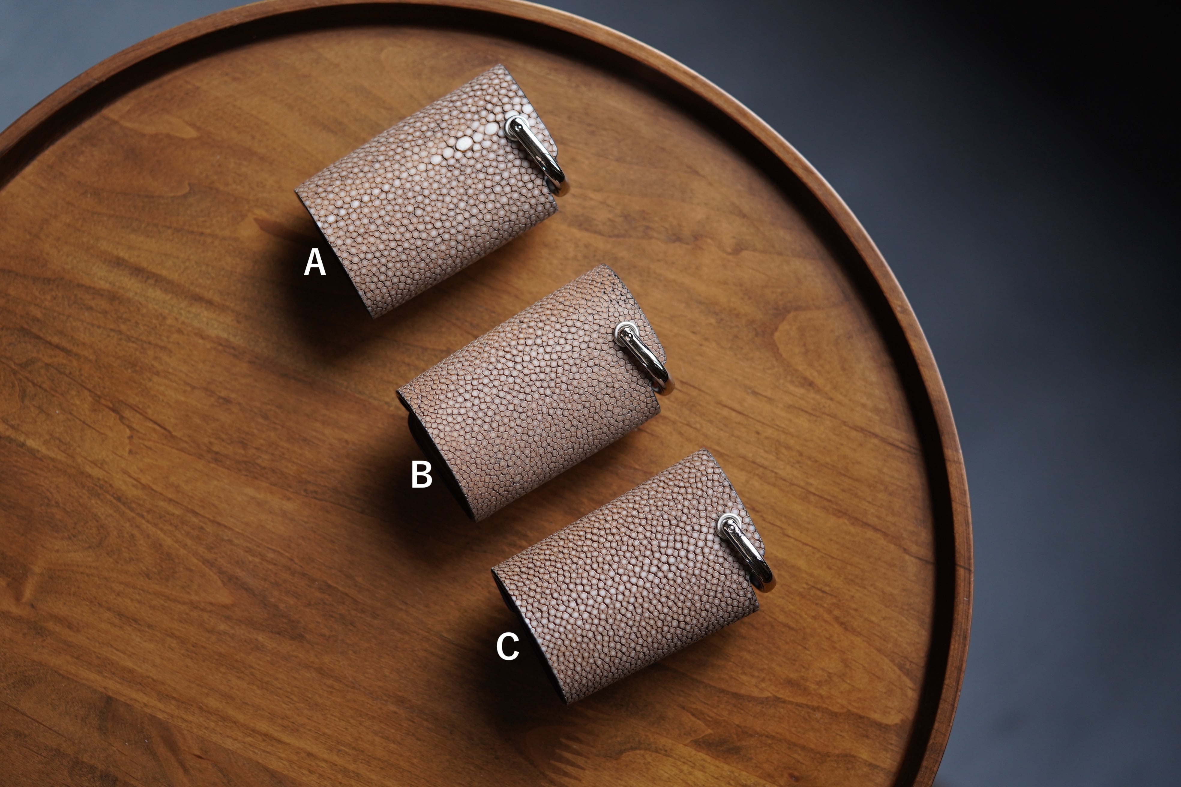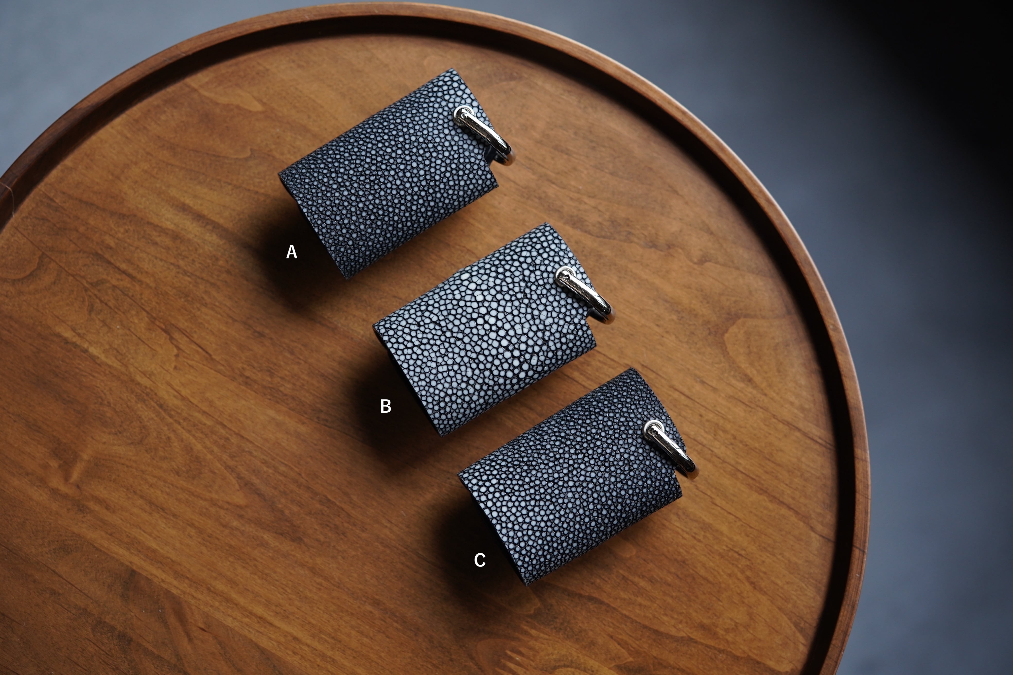 表面を平らに削った「吟スリ」のエイ革を使用。光源の下で宝石のようにキラキラ光る独特の革。
