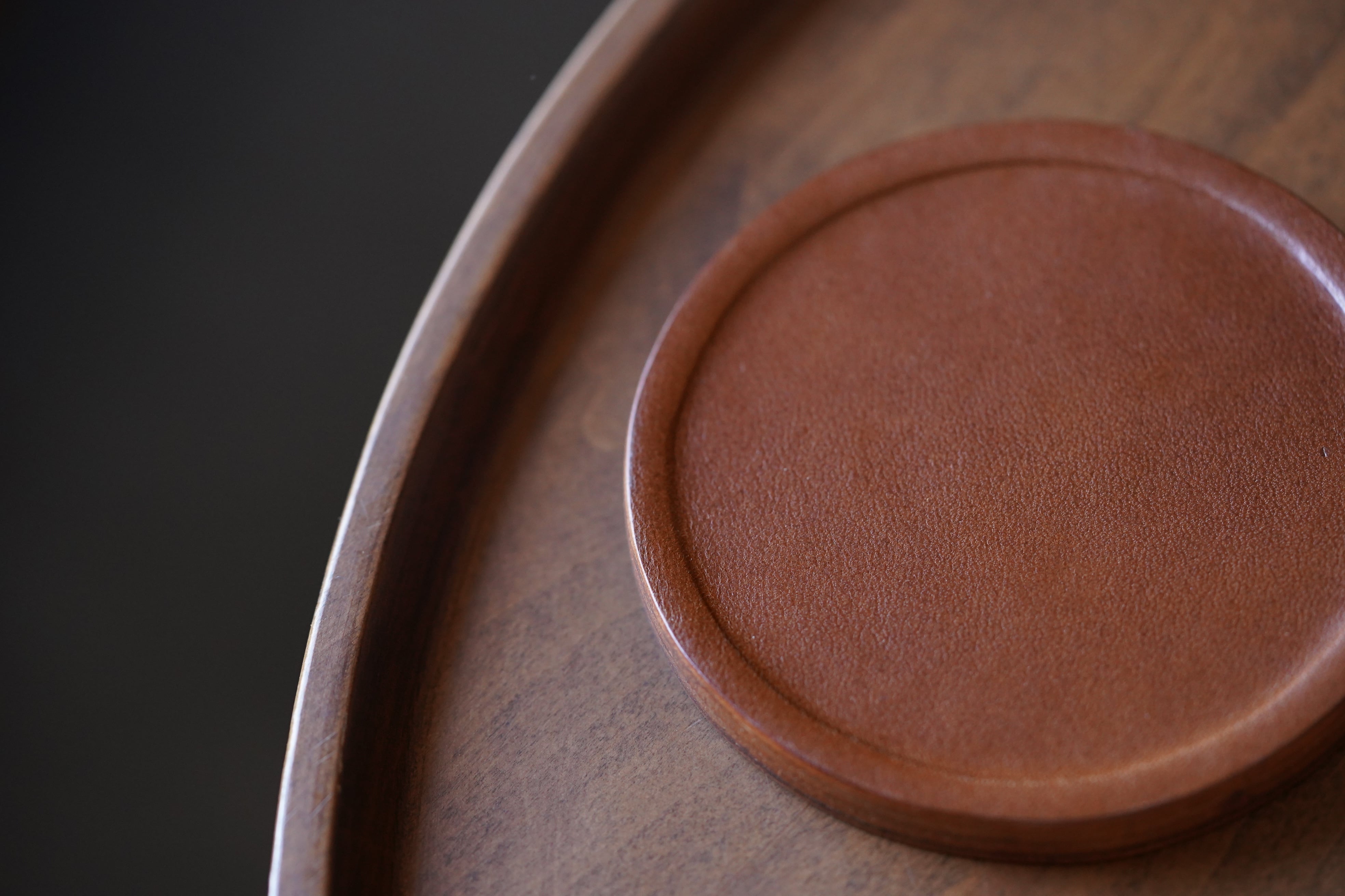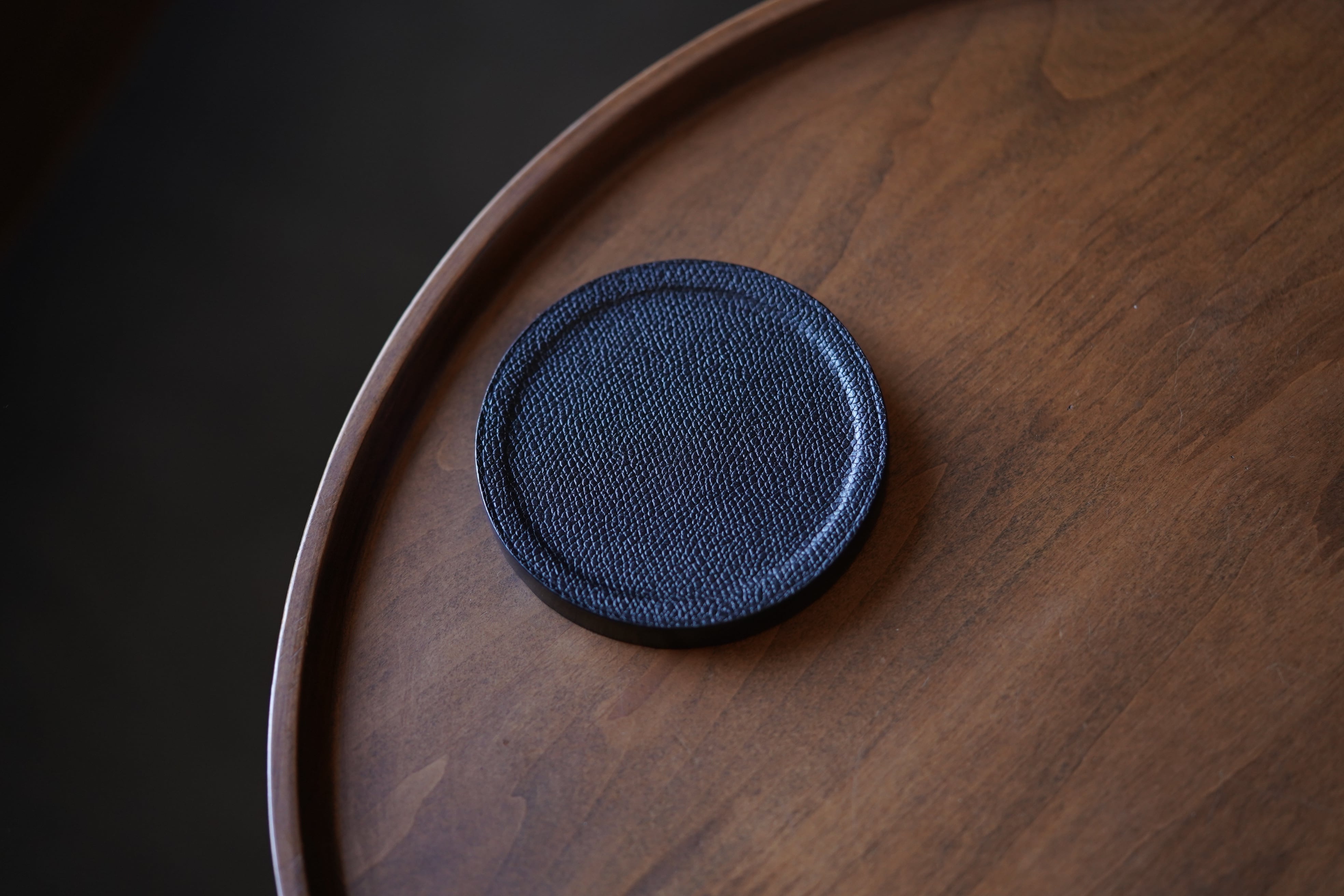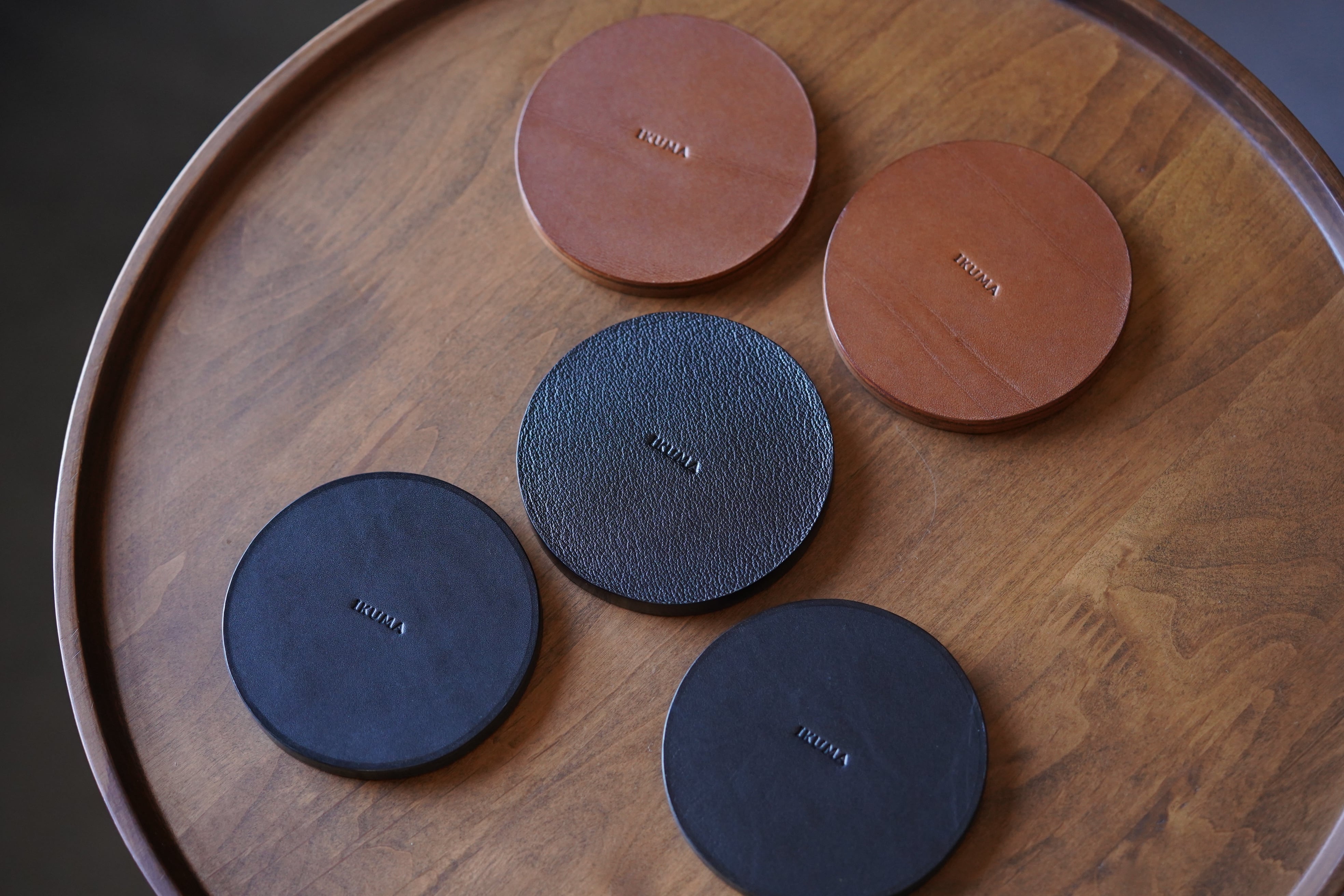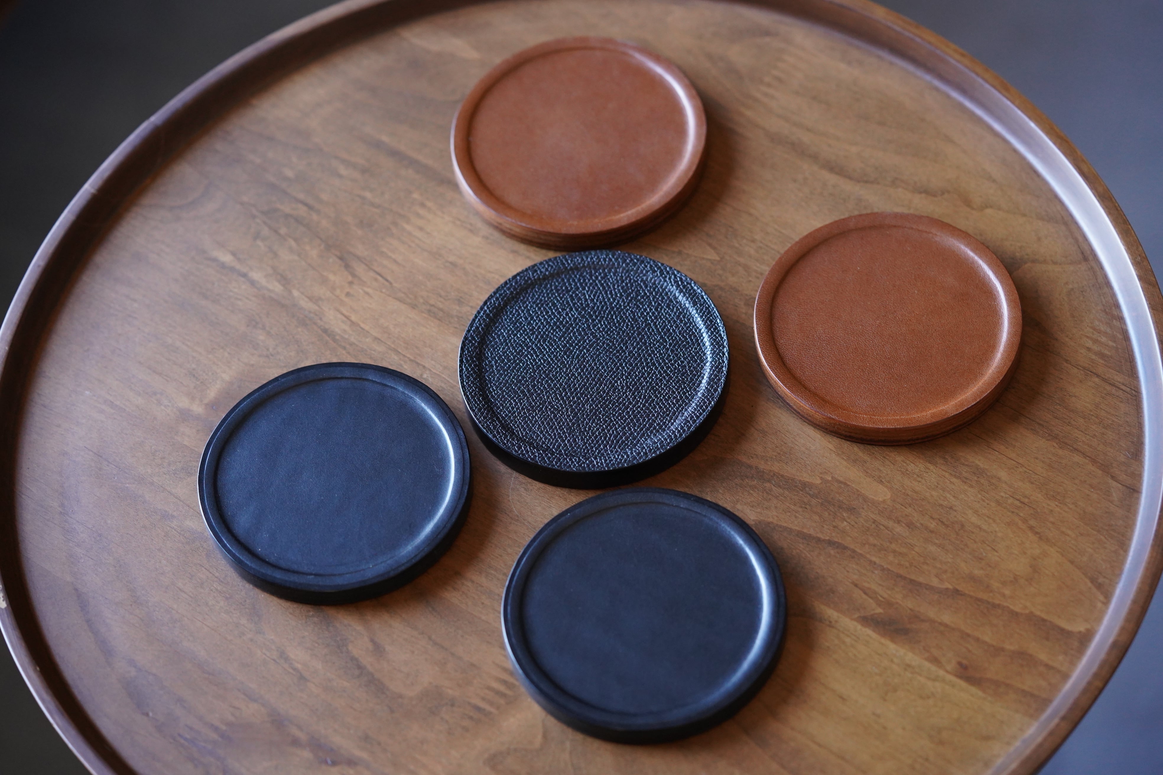 積革(つみかわ)という革を重ねる技法で製作したコースター。