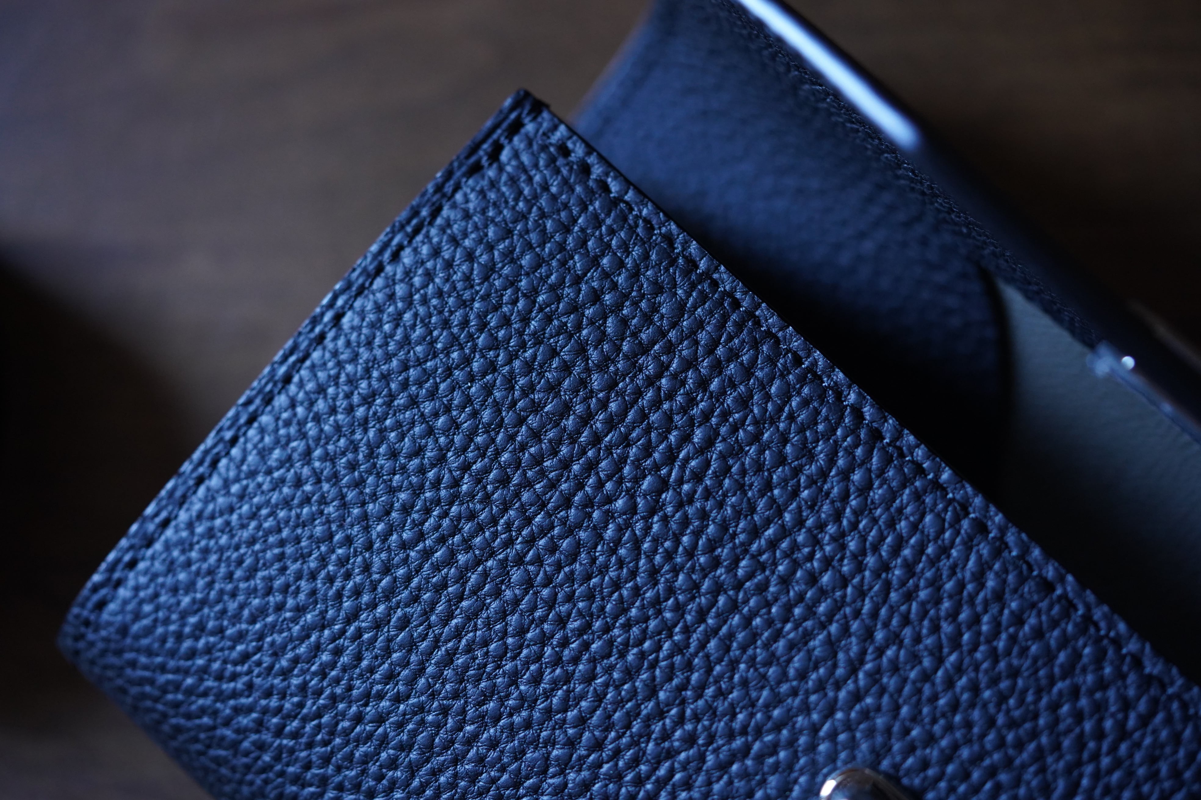 カーフとよばれる子牛の革をクロムで鞣しています。カーフはしなやかで肌理が細かく柔らかいのが特徴です。鞣し剤で収縮させた不均等で深いシボは、キズや曲げ伸ばしに強くキズが目立ちにくいです。